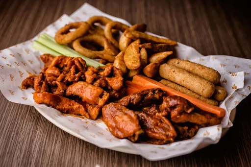"340 gr de alitas y 125 gr de Boneless con salsas de tu elección. Acompañadas con media orden de aros de cebolla, dedos de queso, papas sazonadas, zanahoria y apio."