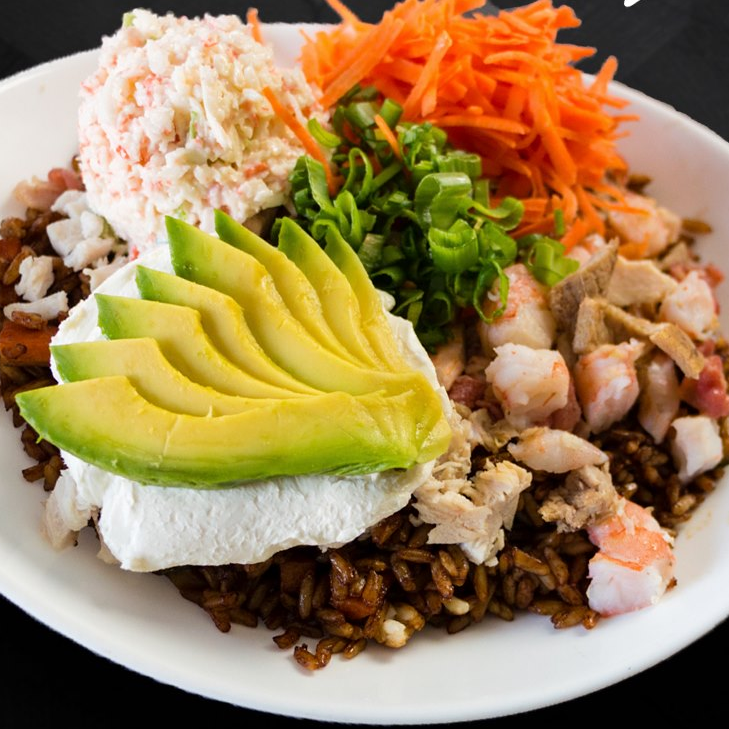 Cama de arroz rellena de Philadelphia, cubierta con trozos de res, pollo, tocino, camarón y aguacate, acompañado de Tampico, zanahoria y cebollín, ordénelo natural o empanizado