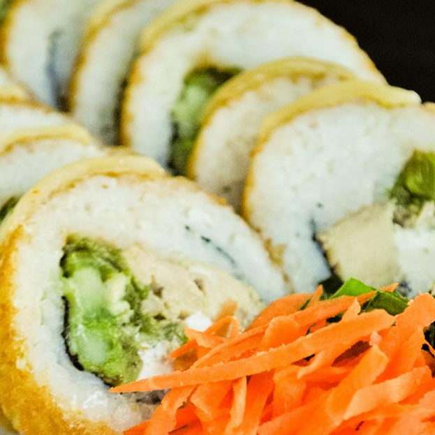 Con alga, relleno de pollo, tocino, Philadelphia, pepino y aguacate, acompañado de Tampico, zanahoria y cebollín, ordénelo natural o empanizado