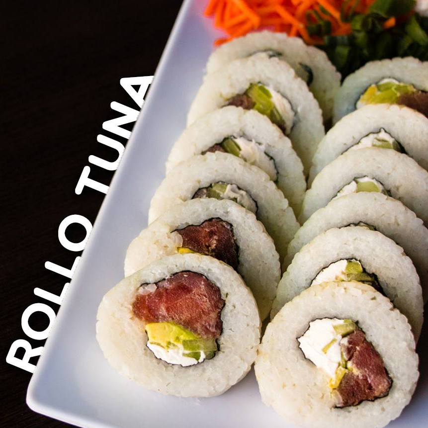 Con alga relleno de atun fresco Philadelphia, pepino y aguacate, acompañado de Tampico, zanahoria y cebollín, ordénelo natural o empanizado