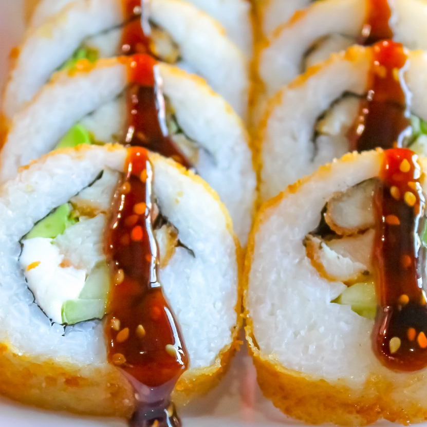 Con alga, relleno de surimi, pepino, aguacate y Philadelphia. Bañado en salsa de anguila.