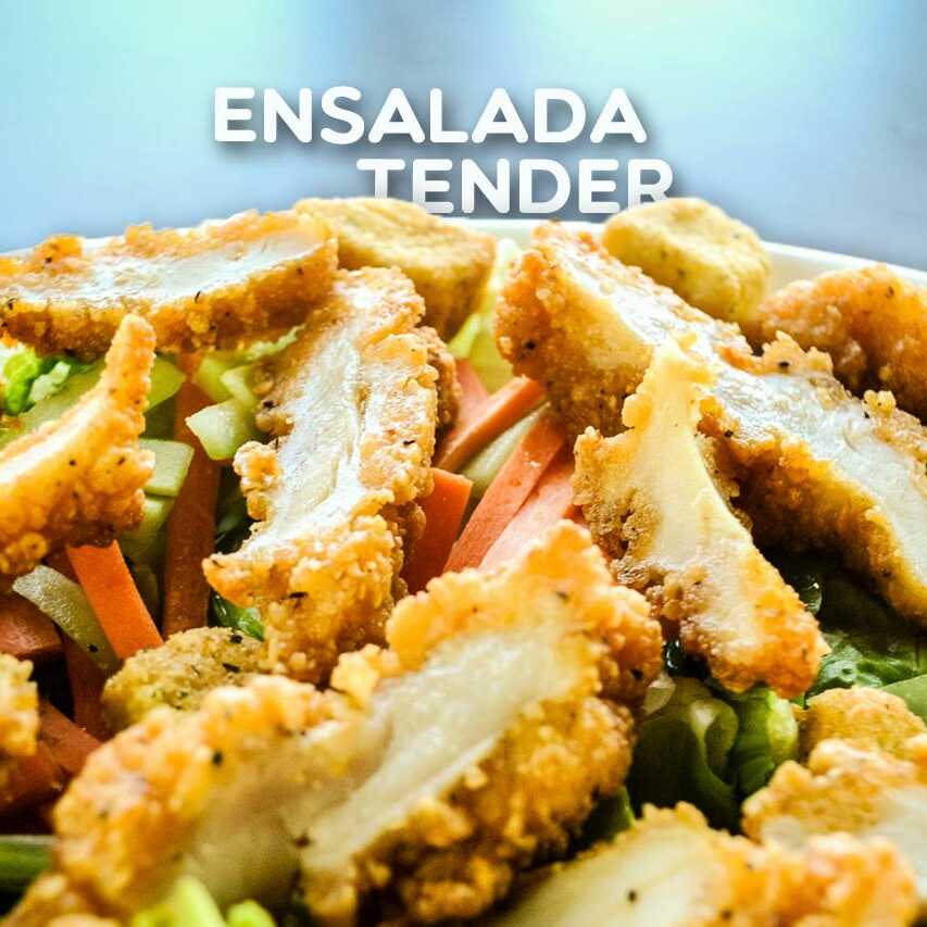200 gr. de tiras de pollo empanizado crujiente sobre una cama de lechuga picada, zanahoria rallada y trozos de pepino, decorada con aguacate y aderezo al gusto