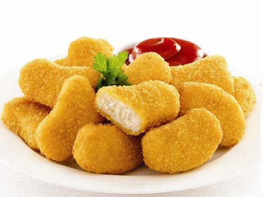 200 gr de esferas de pollo empanizadas acompañadas de 250 gr de papas sazonadas en gajos cubiertas de queso amarillo