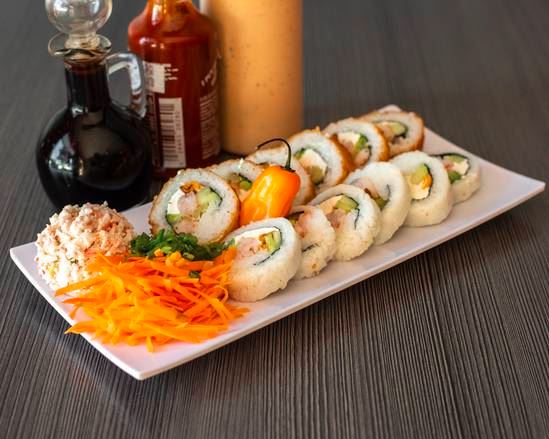 Con alga, relleno de camarón, surimi, ostión ahumado, Philadelphia, pepino y aguacate, acompañado de Tampico, zanahoria y cebollín, ordénelo natural o empanizado