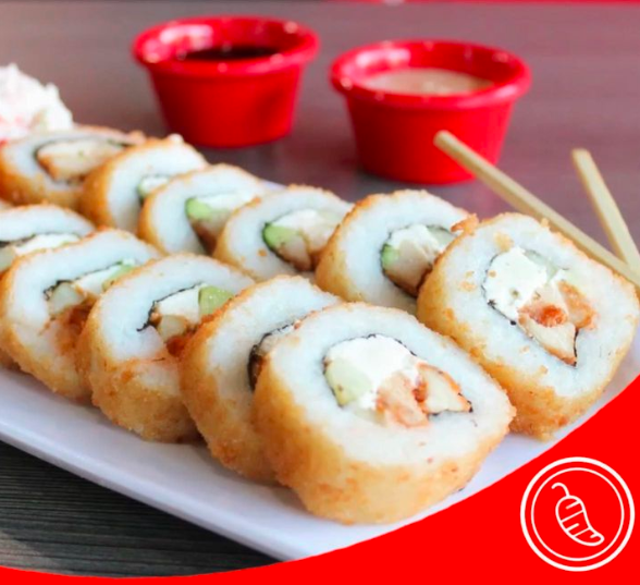Con alga relleno de pollo, res, camarón, pepino, aguacate y Philadelphia. Incluye tampico, zanahoria y cebollín. Pídelo empanizado o al natural.