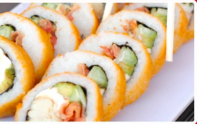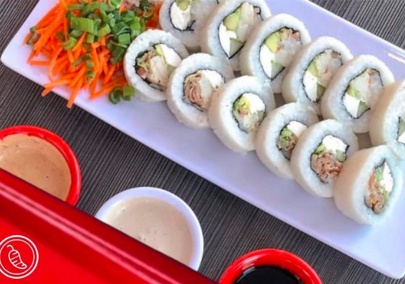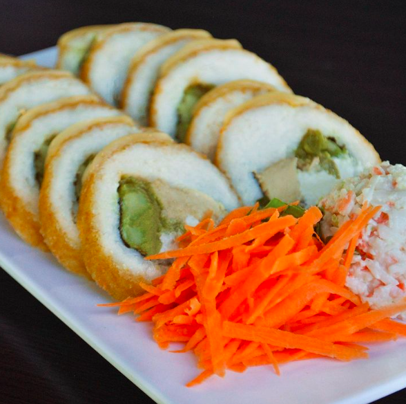 Con alga, relleno de zanahoria, pepino, aguacate y Philadelphia. Incluye tampico, zanahoria y cebollín. Pídelo empanizado o al natural.