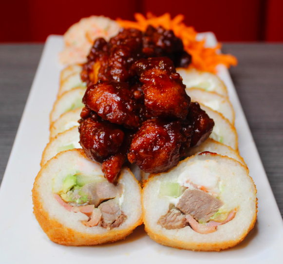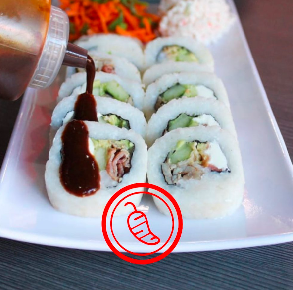 Con alga, relleno de res, pollo, tocino, pepino, aguacate y Philadelphia. Incluye tampico, zanahoria y cebollín. Pídelo empanizado o al natural.