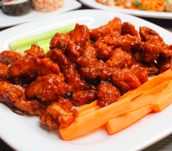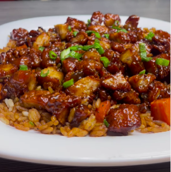 Cuadros fritos de pollo empanizado (tenders), sobre una cama de arroz frito con finas verduras y cebollín encima. Pídelo con salsa de naranja o picoso habanero por el mismo precio.