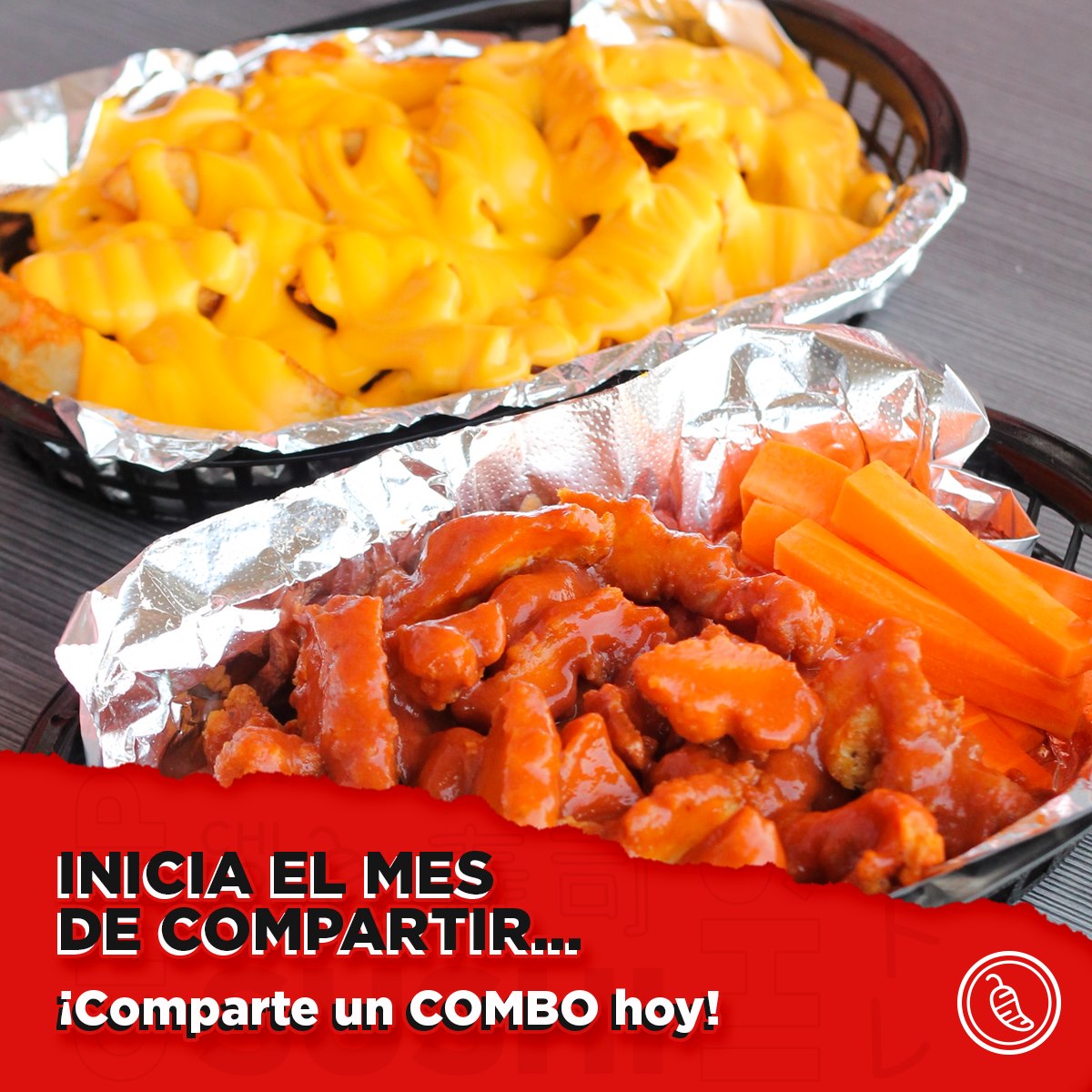 200 gr. de tiras de pollo empanizado crujiente, cubiertas con salsa de tu elección,acompañadas con 250 gr. de papas en gajos sazonadas cubiertas de queso amarillo