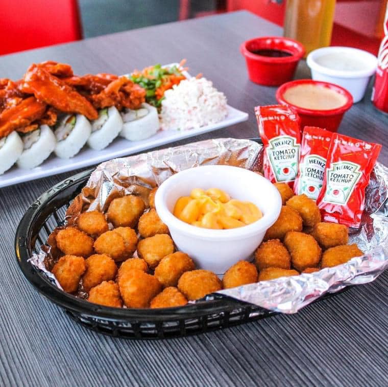 Con alga, relleno de pollo empanizado en salsa Búfalo, Philadelphia, pepino y aguacate, acompañado de Tampico, zanahoria y cebollín, ordénelo natural o empanizado