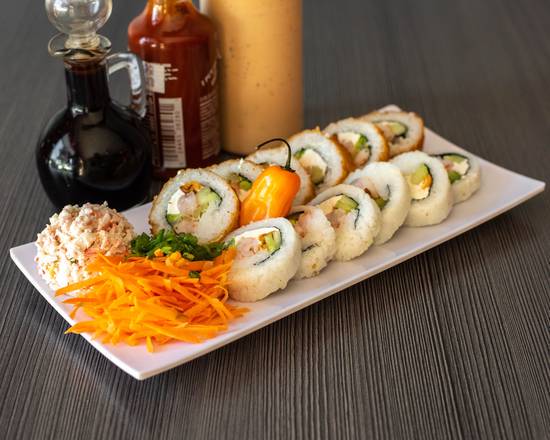 Con alga, relleno de camarón, chile Caribe toreado, chile habanero toreado, Philadelphia, pepino y aguacate, acompañado de Tampico, zanahoria y cebollín, ordénelo natural o empanizado