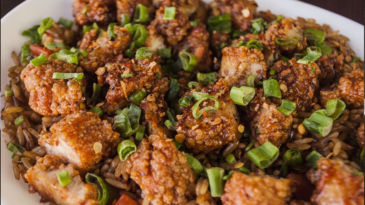 250 gr. de cuadritos de pechuga empanizada crujiente sobre una cama de arroz frito con finas verduras, ordénelo con salsa naranja o picosa
