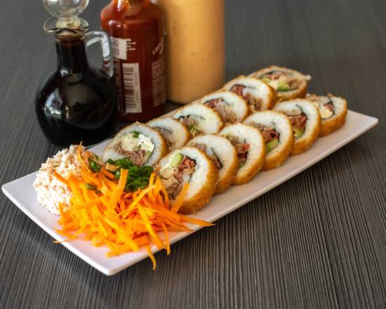 Con alga, relleno de res, tocino, Philadelphia, pepino y aguacate, acompañado de Tampico, zanahoria y cebollín, con salsa chipotle por fuera, ordénelo natural o empanizado