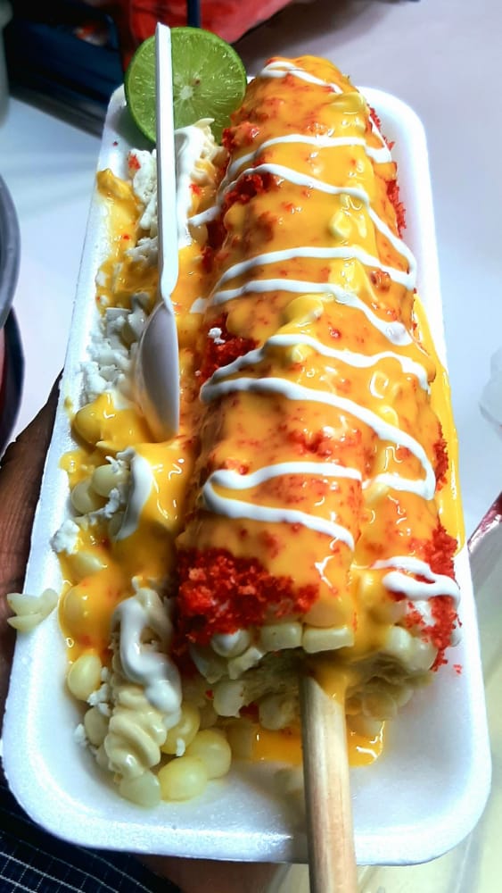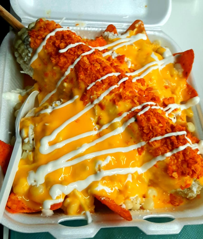 1 Elote entero, Sabritas a escoger, granos de elote, mantequilla, queso blanco, crema, limón, bañados con queso amarillo.