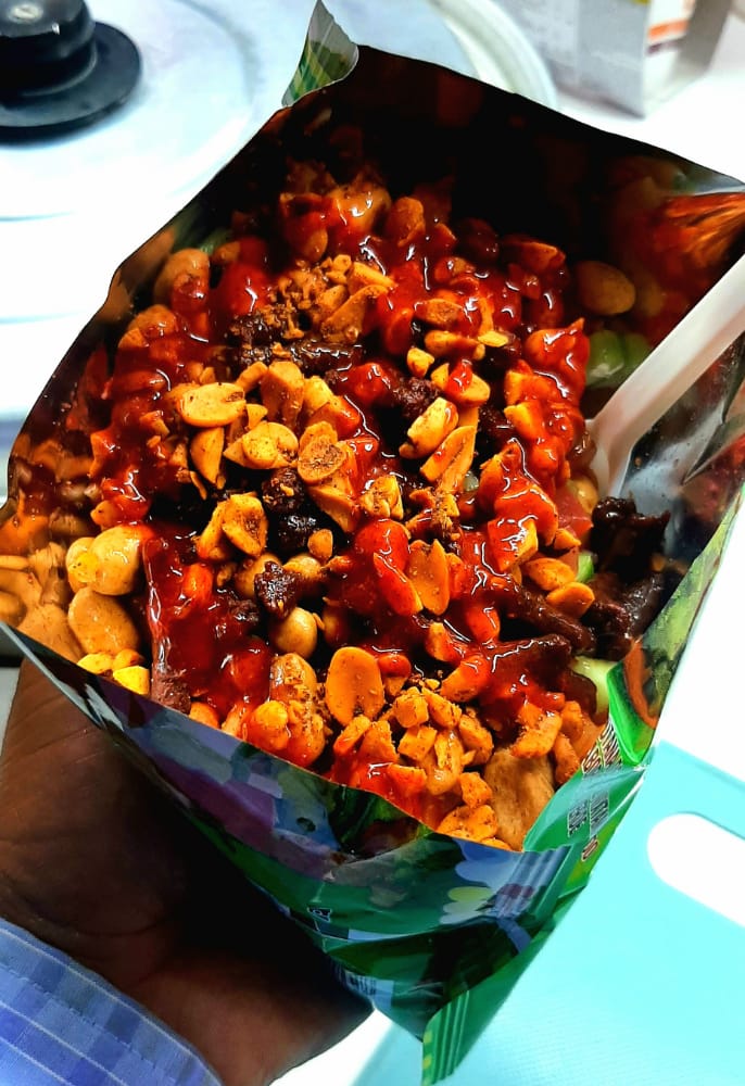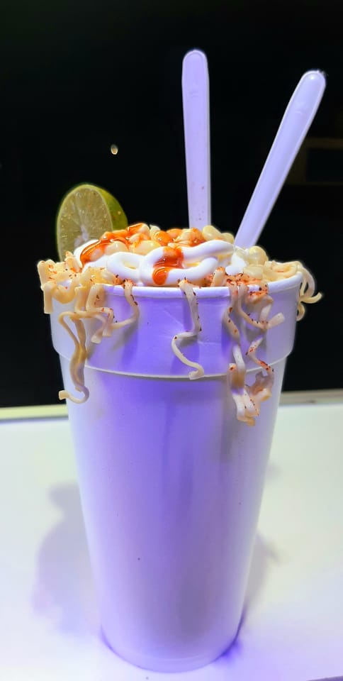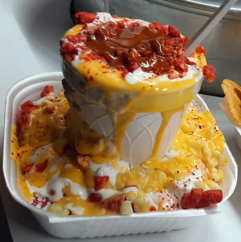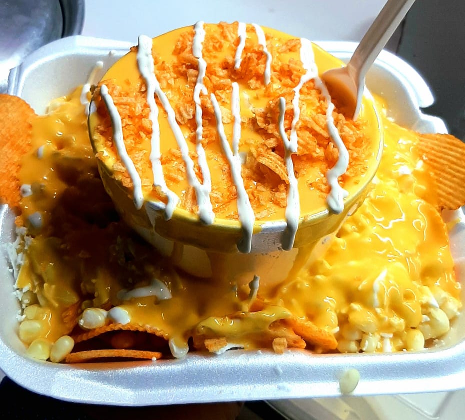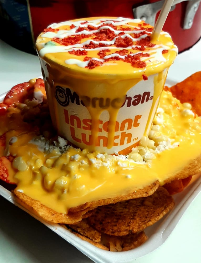 1 Maruchan, Sabritas a escoger, granos de elote, mantequilla, queso blanco, crema, limón, bañados con queso amarillo.