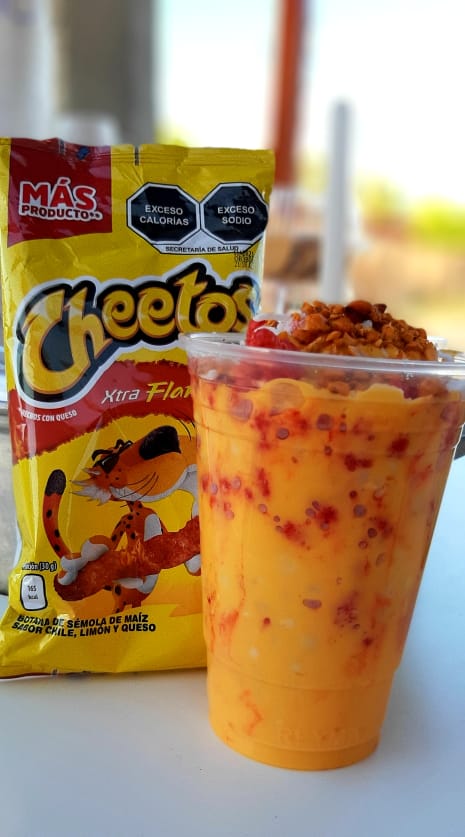 Vaso de 20 oz, 1 Sabritas Cheetos Flamin´, granos de elote, queso blanco, queso amarillo, cacahuate.