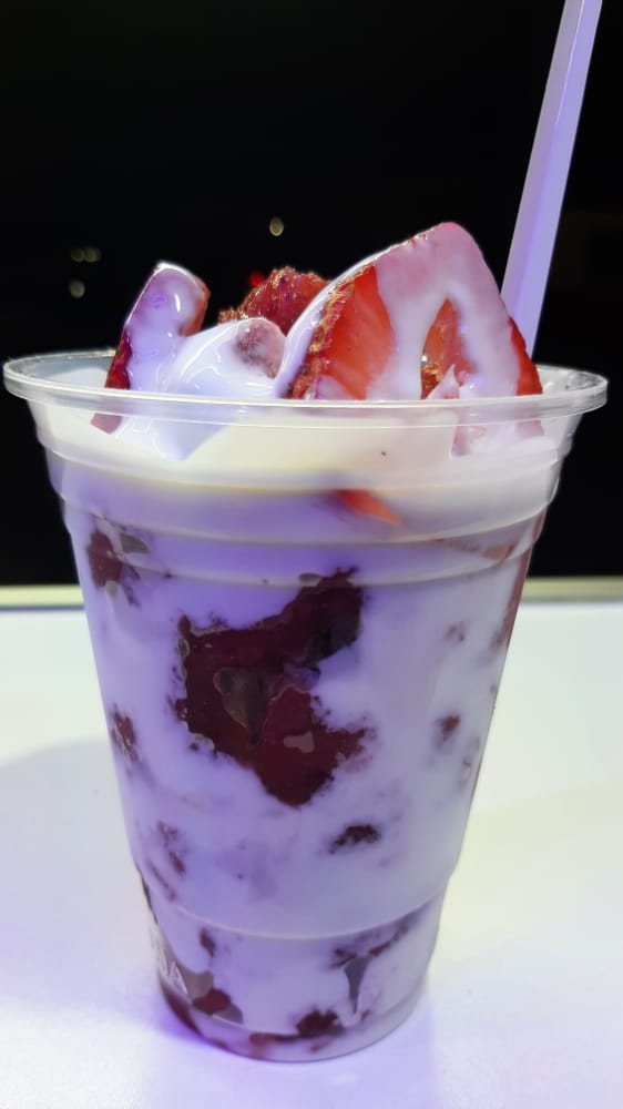 Vaso de medio litro 16 oz, con fresas congeladas bañadas con crema.