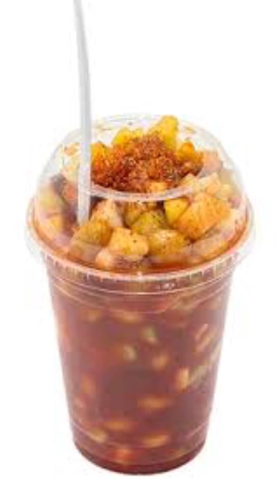 Vaso de 16 onzas. Cacahuate, pepino, tamarindo en trocitos, clamato (chamoy, salsa, limón).