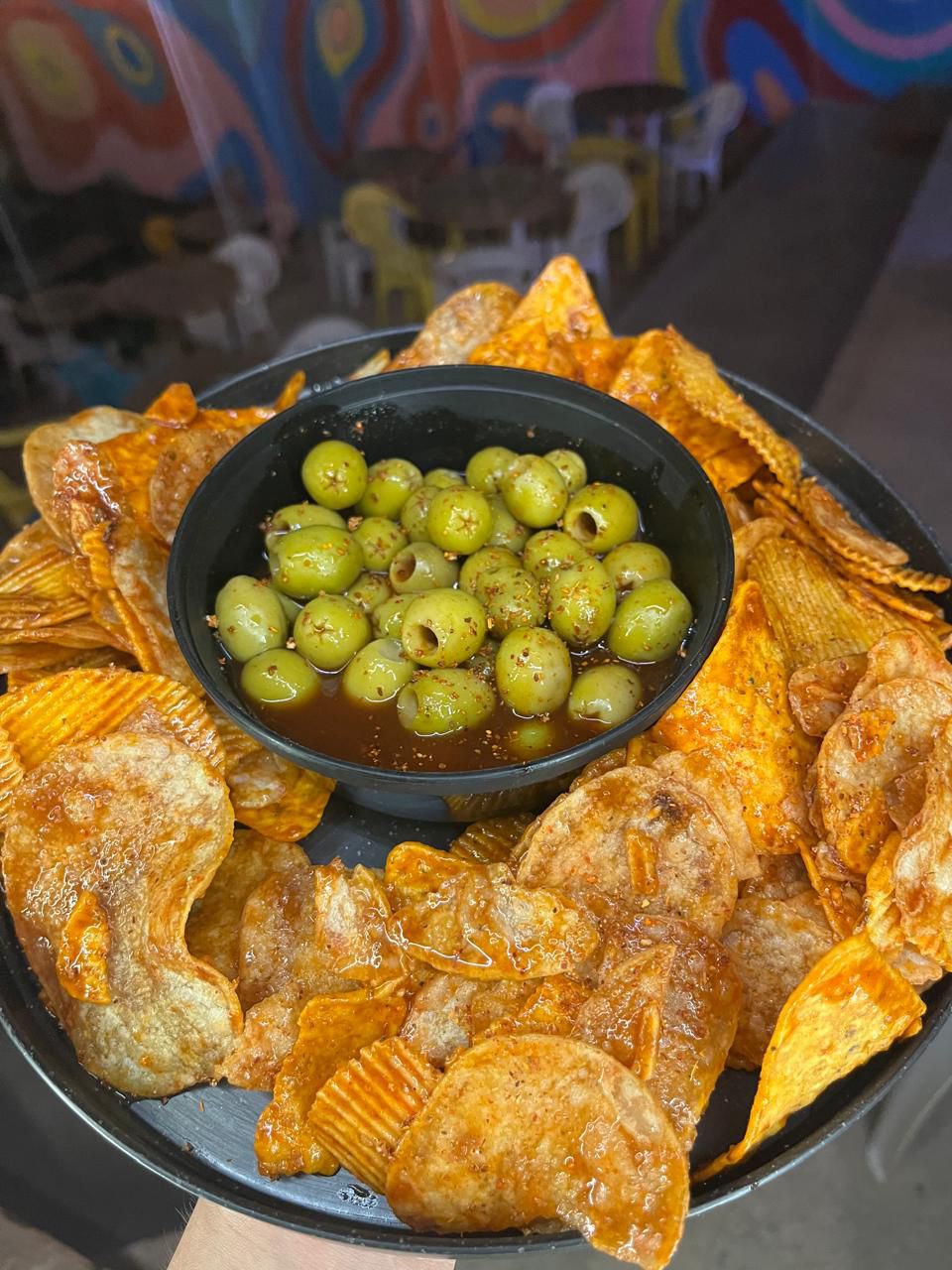 Charola con 3 sabritas salseadas y orden de aceitunas al centro.