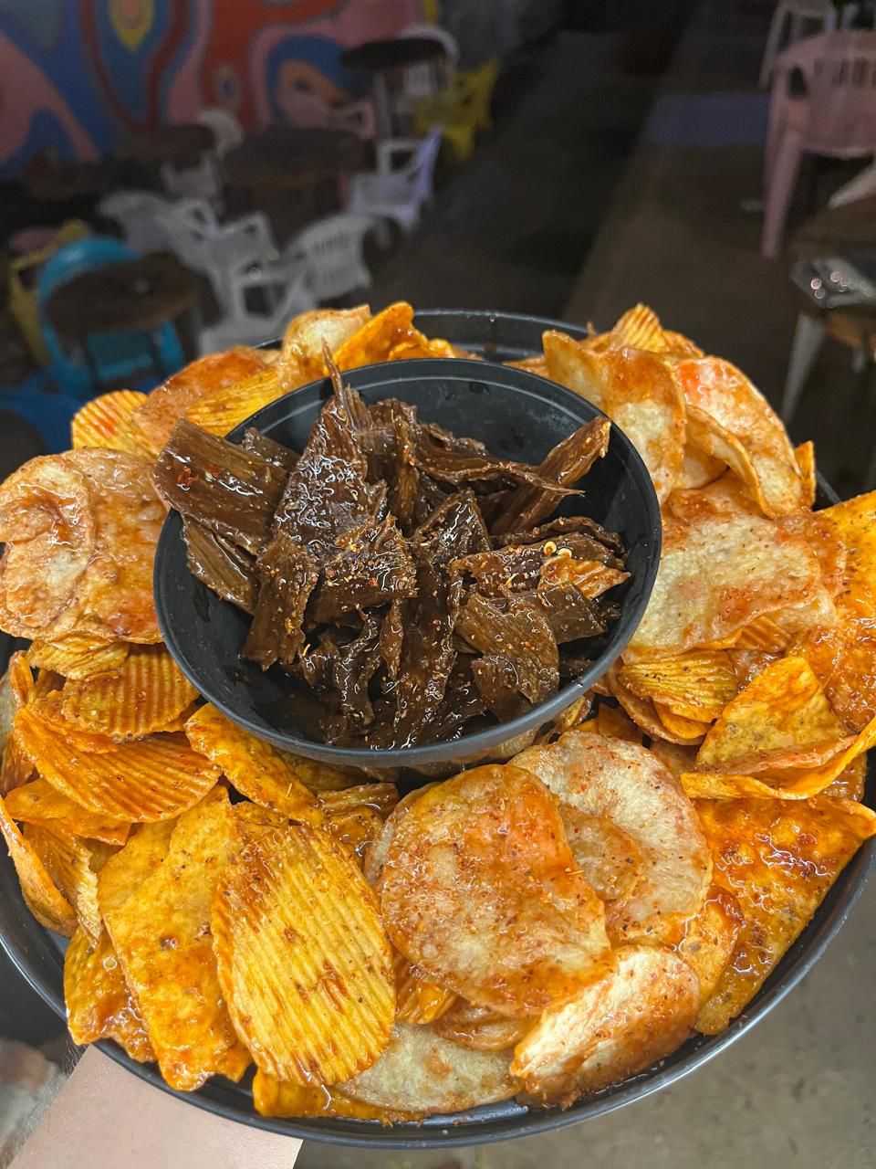 Charola con 3 sabritas salseadas y orden de carne seca al centro.