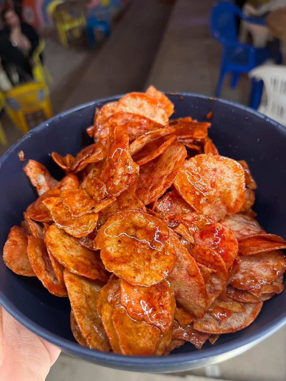 100 Gramos de chicharrón de cerdo, salsa cinema, tajín y limón.