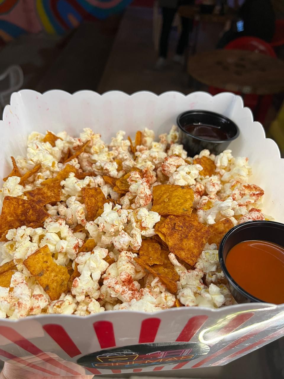 Charola de maruchan, 2 sabritas, salsa cinema, cubiertas de queso cheddar.