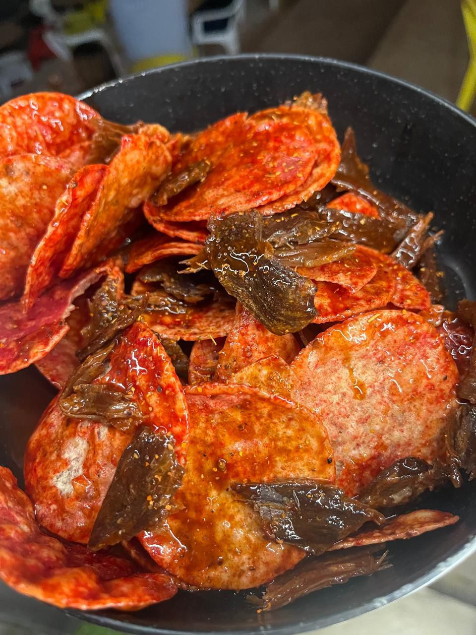 100 Gramos de carne seca con salsa cinema, tajín y limón.