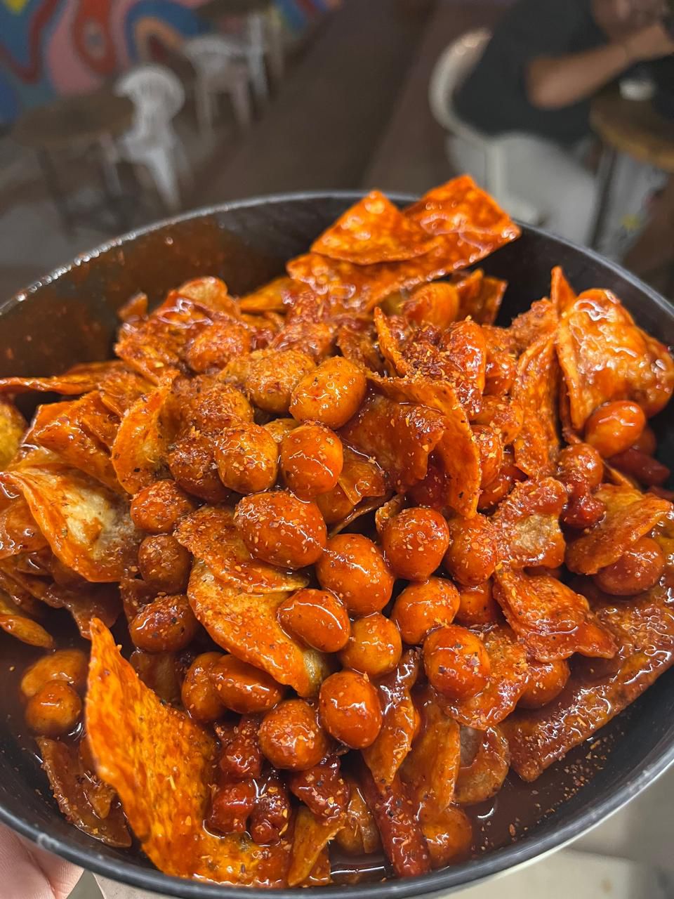 150 Gramos de cacahuate japonés, rielito, salsa cinema, limón y tajín.