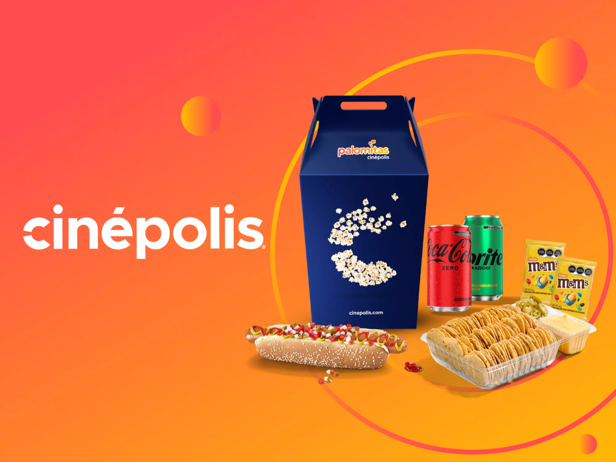 1 palomitas para llevar Cinépolis®+ 3 Nachos + 3 refrescos de lata Coca Cola®.