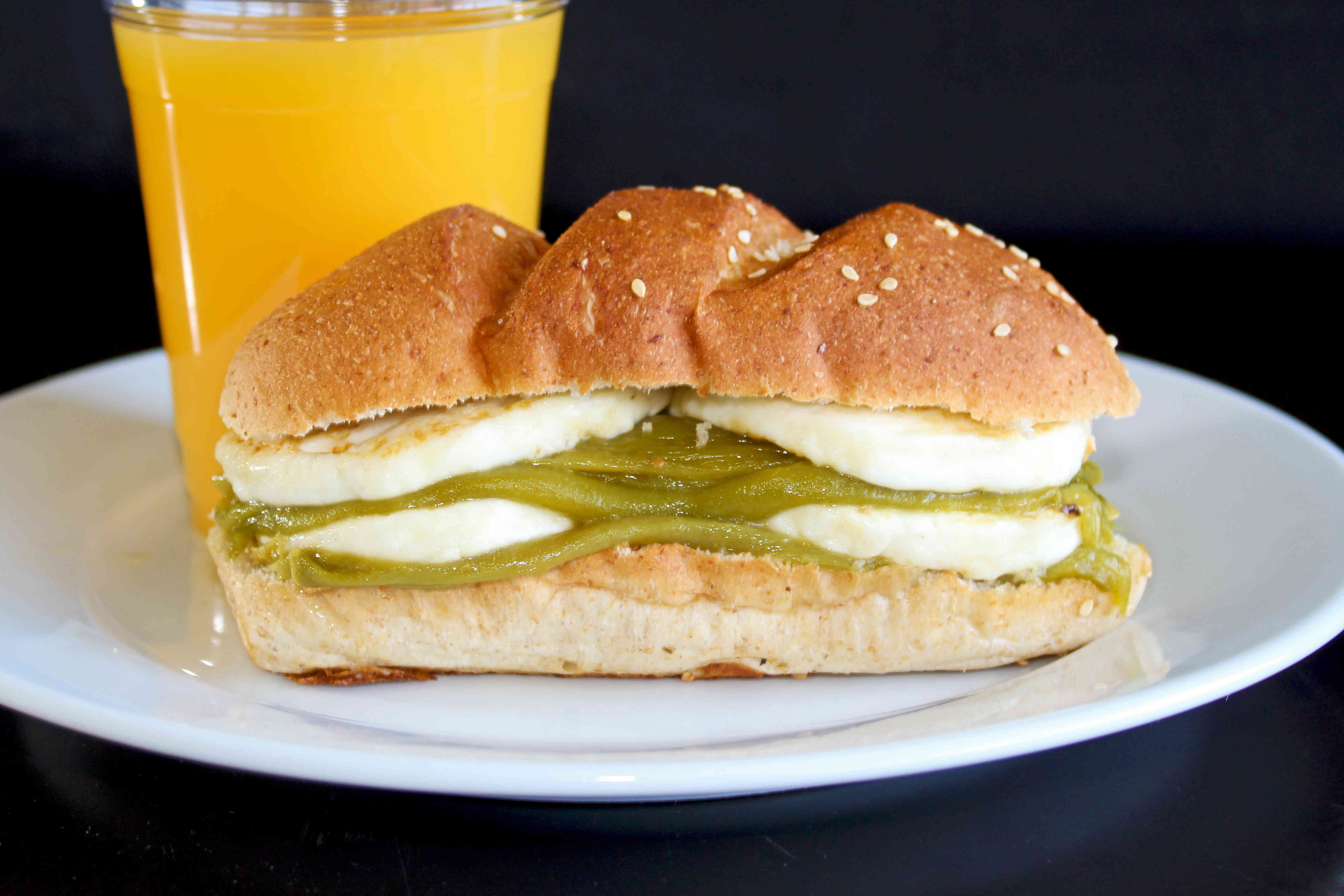 Mini Baguette con queso panela, chile verde tatemado y aderezo.