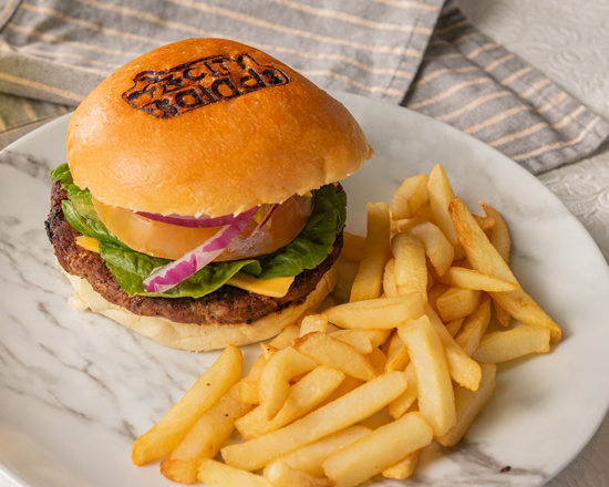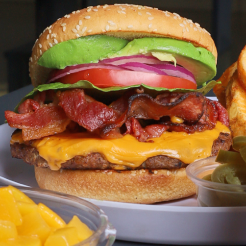 Hamburguesa de res preparado con tocino en pan brioche, mozzarella, lechuga, tomate, cebolla y aguacate acompañado de papas a la francesa.