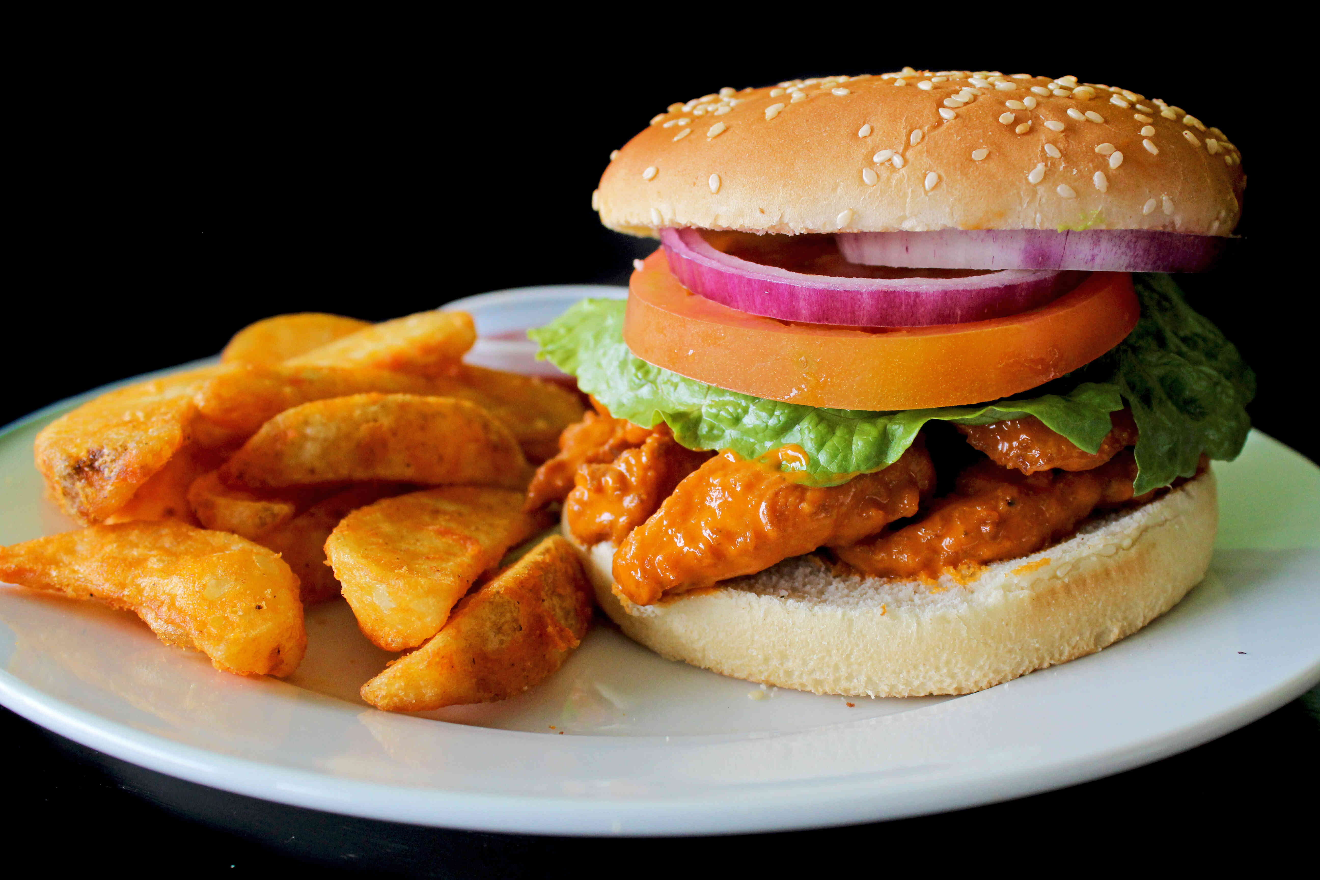 Hamburguesa con boneless, lechuga, tomate, cebolla y aderezo, y papas sazonadas.