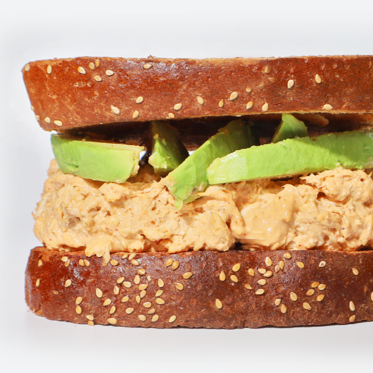 Sándwich con ensalada de atún, tomate, aguacate y lechuga.