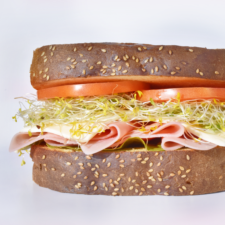 Sándwich con jamón de pavo, queso mozzarella, lechuga, tomate, alfalfa y aderezo chipotle.