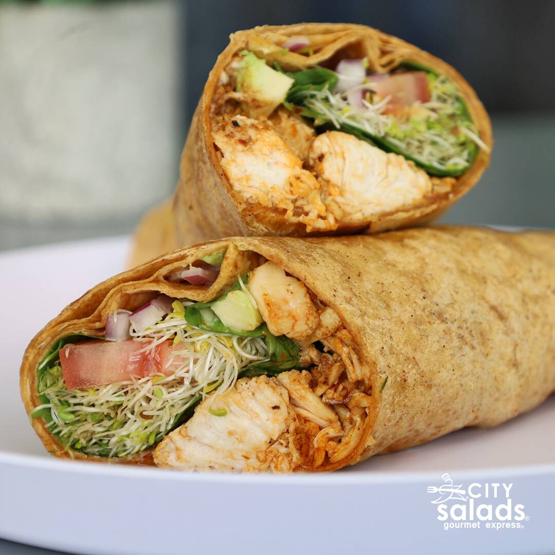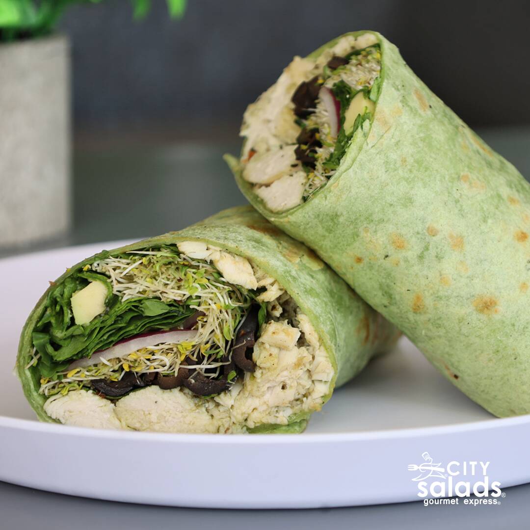 Wrap de pollo natural (250 grs.), pesto, mayonesa, lechuga orejona, espinaca, alfalfa, cebolla morada, aceituna negra, aguacate y aderezo ranch.
