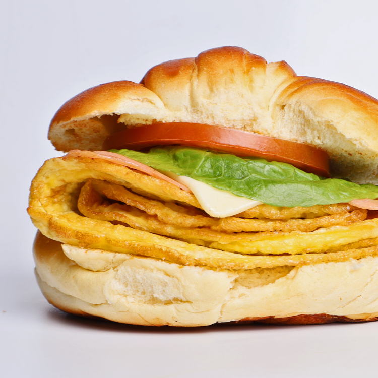 Croissant con omelette, jamón, queso mozzarella, tocino y aderezo.