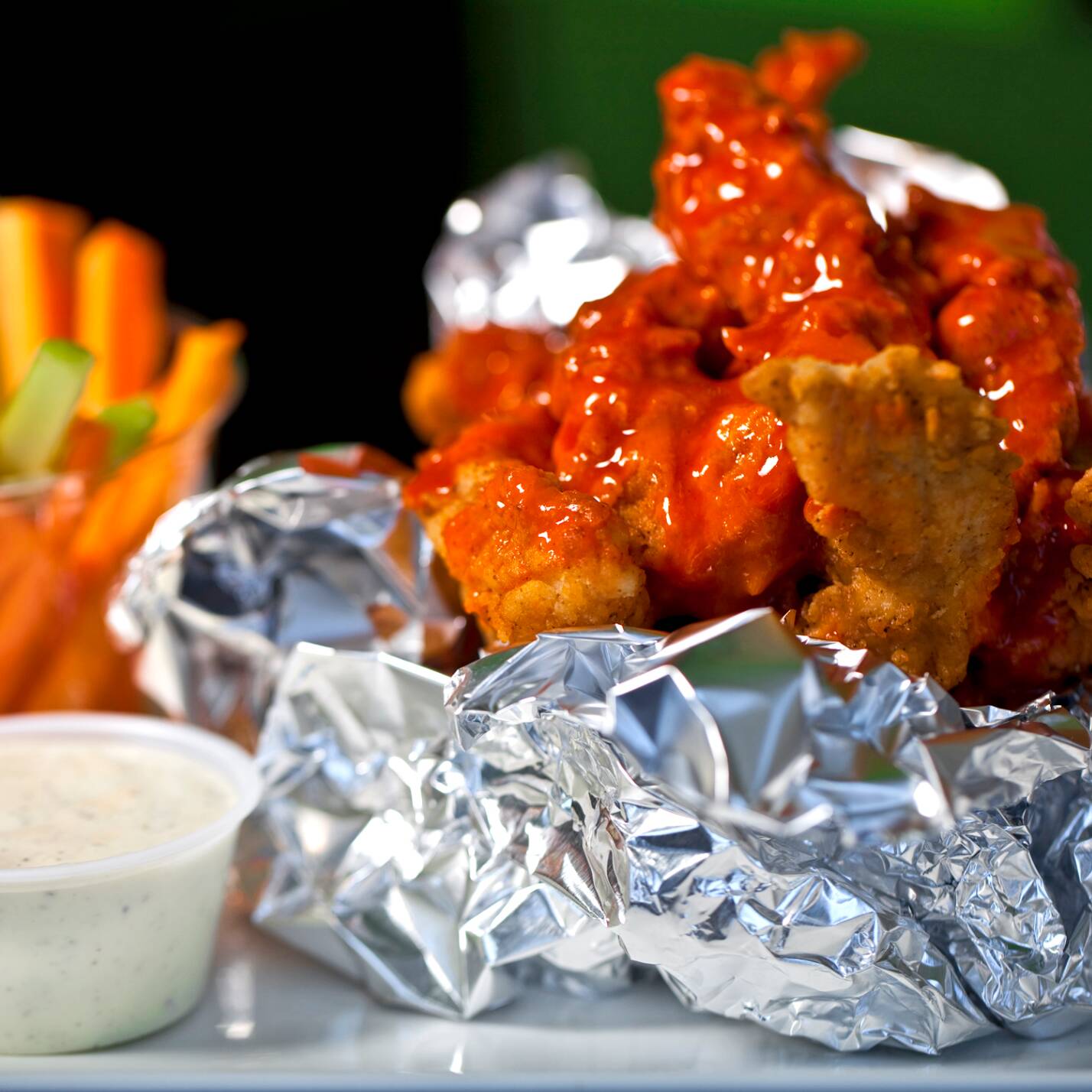 Boneless bañados en salsa BBQ o Búfalo con zanahorias, apio y aderezo ranch.
