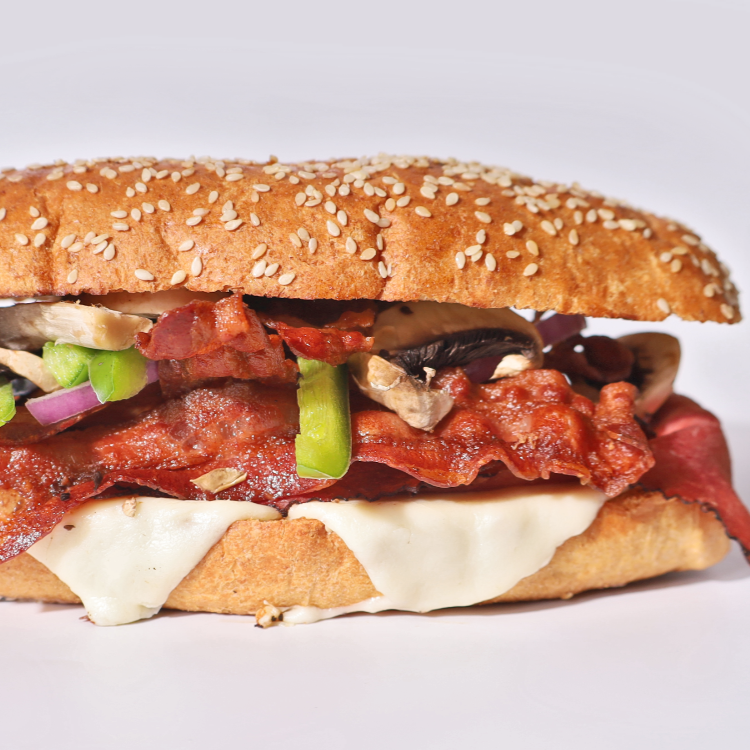 Baguette, mozzarella, roast beef, tocino, pimiento verde, champiñones, cebolla, aderezo chipotle.