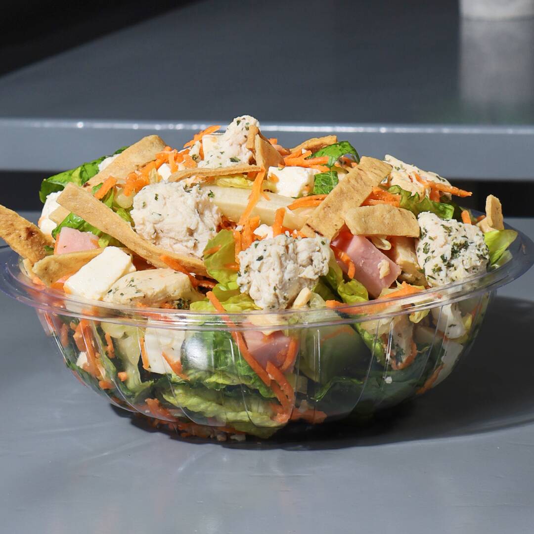Cama de lechuga + 2 porciones de pollo + 5 ingredientes barra fría + crouton o fritura + queso parmesano, aderezo y ajonjolí.