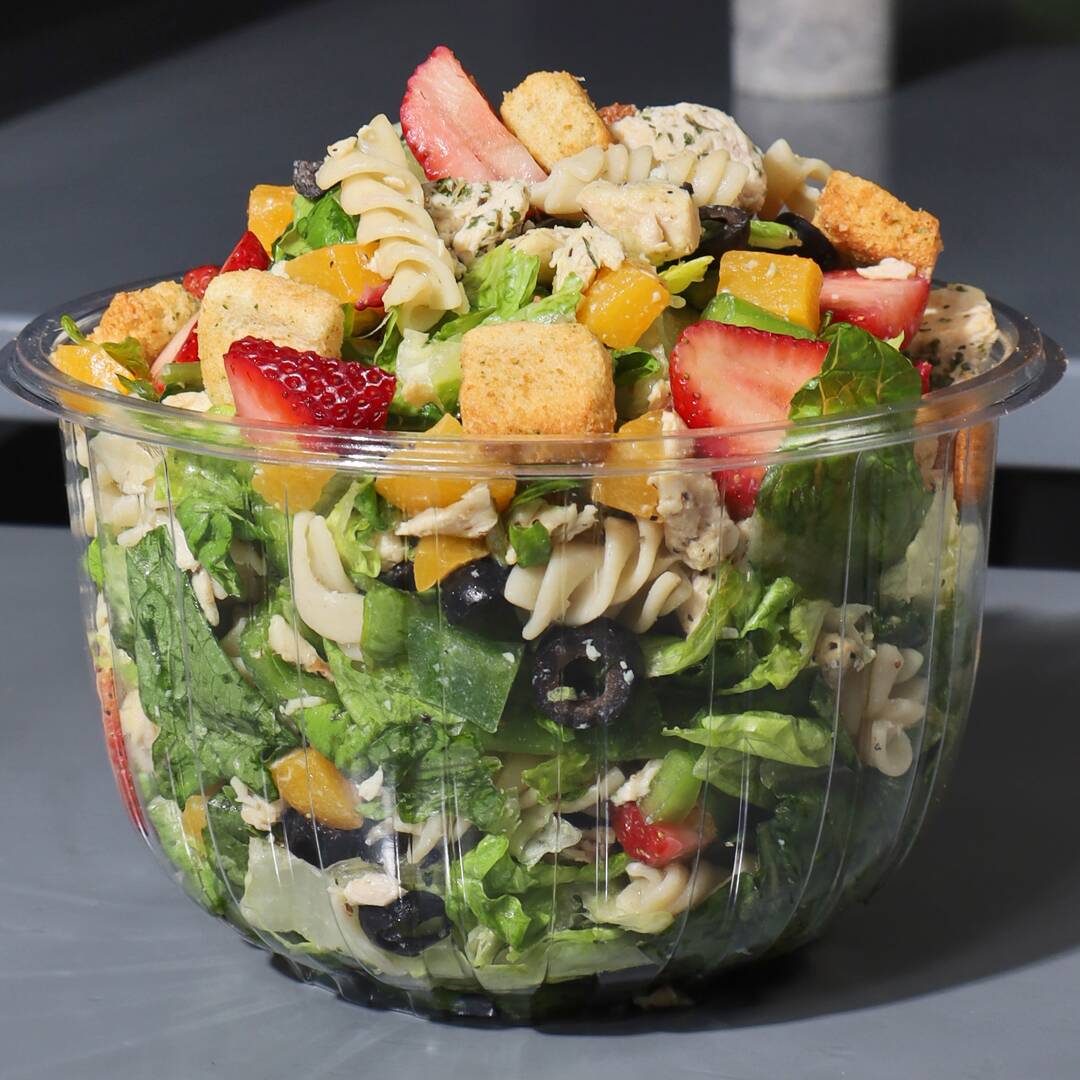Cama de lechuga + 2 porciones de pollo + 4 ingredientes barra fría + crouton o fritura + queso parmesano, aderezo y ajonjolí.