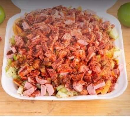 Cama de papitas surtida, pepino, rielito, cacahuate, camarón y winie salseado.