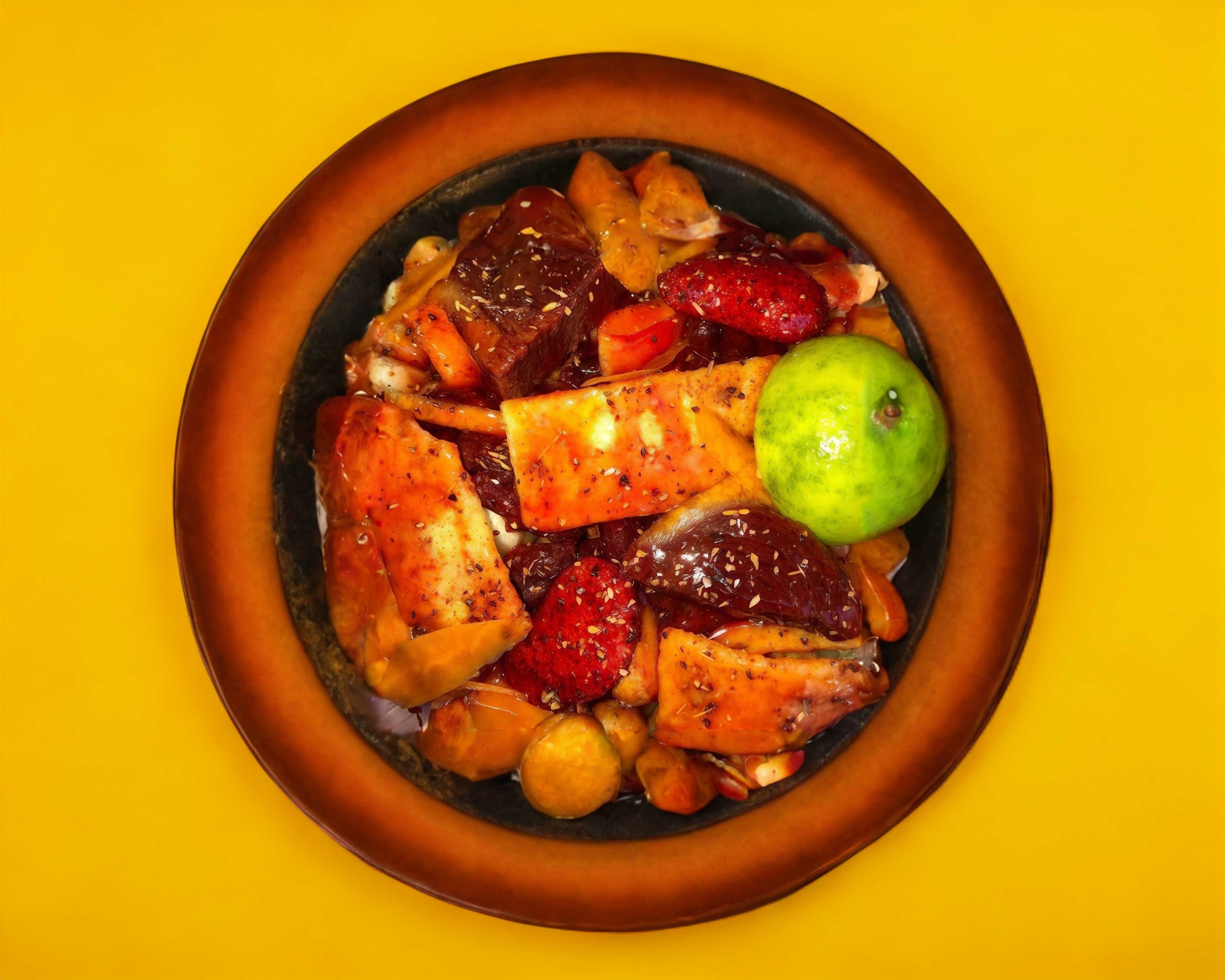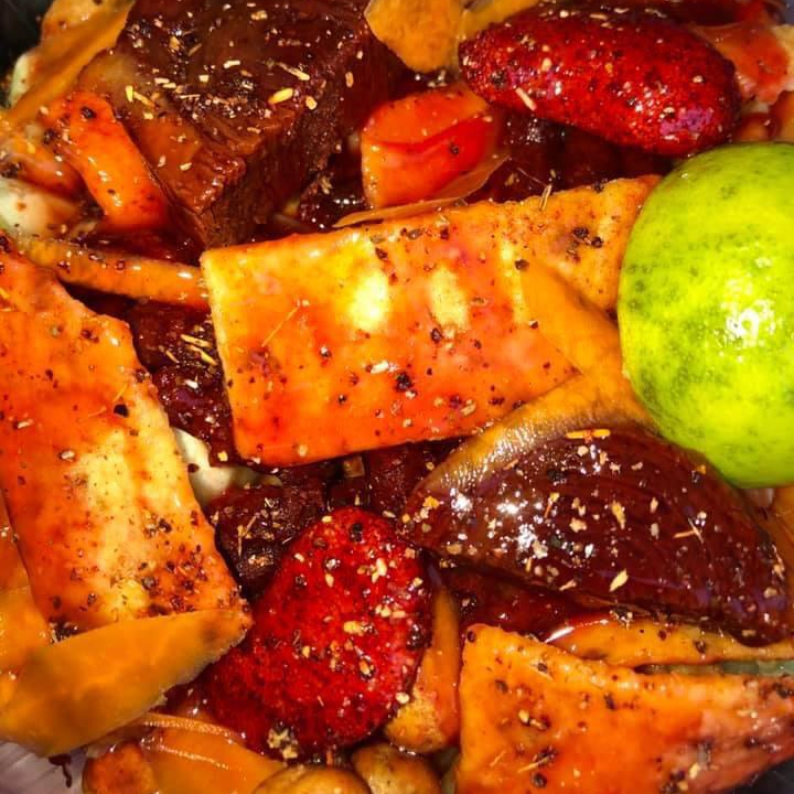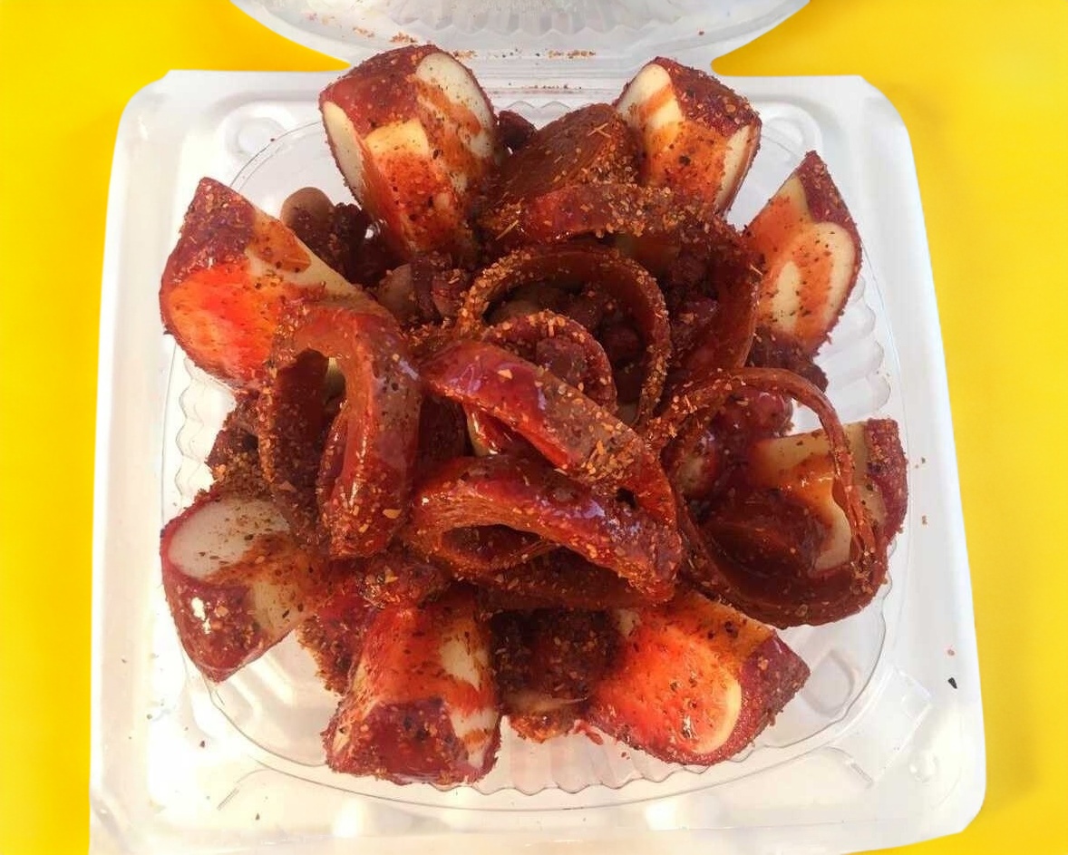Cubierta de pulpa de tamarindo, cacahuate, rIelito, serpentina de tamarindo, limón, salsa y chamoy.