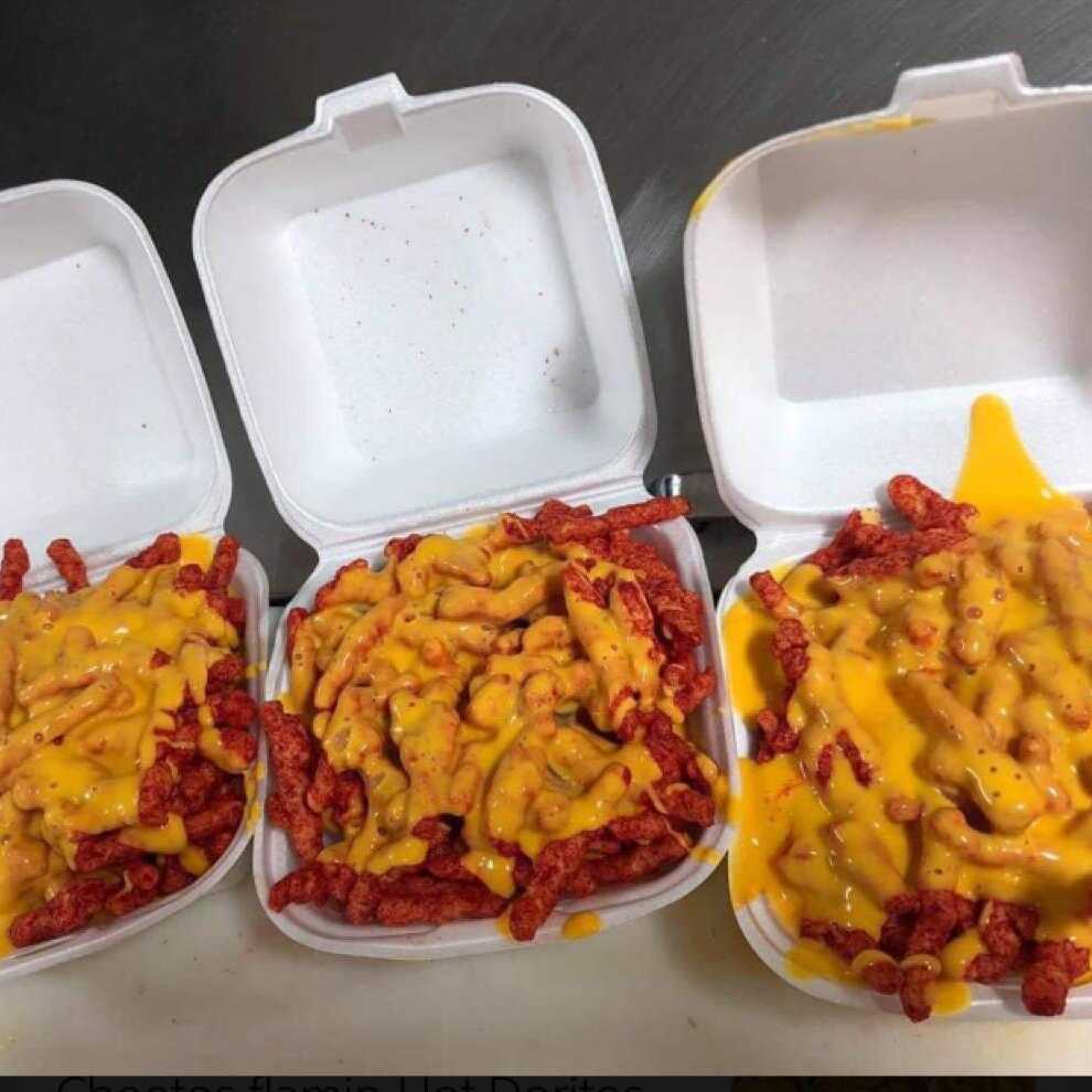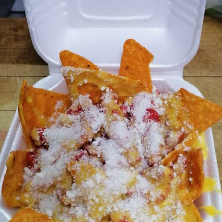 Cheetos flamin hot, Doritos nachos, queso amarillo, queso blanco, limón y Tajín.