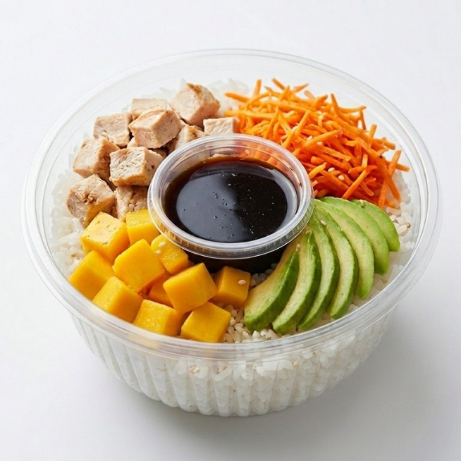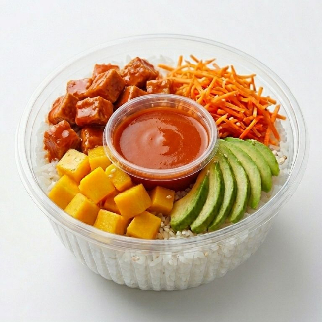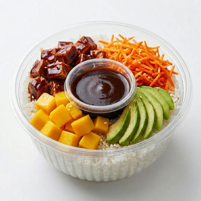 Base arroz, pollo a la plancha en salsa bbq, zanahoria rayada, mango y aguacate