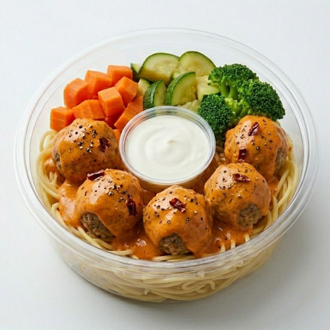 Base spaguetti, albondigas en chipotle, vegetales al vapor, zanahoria, calabaza y brocoli