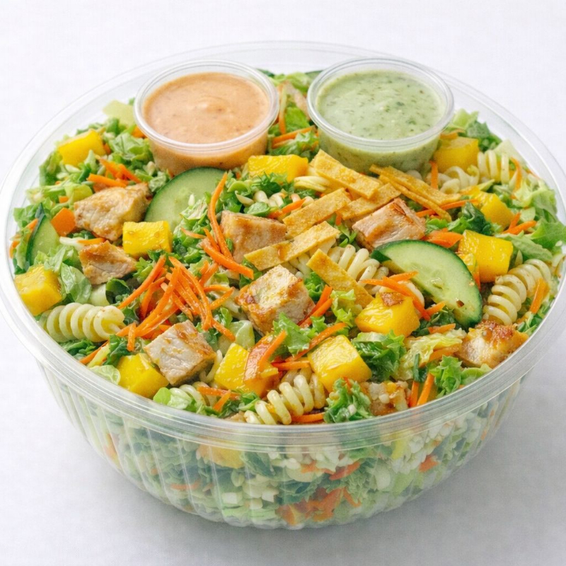 Base lechuga, pollo a la plancha, zanahoria rayada, mango, pasta, pepino y frituras acompañado de aderezo cilantro y chipotle