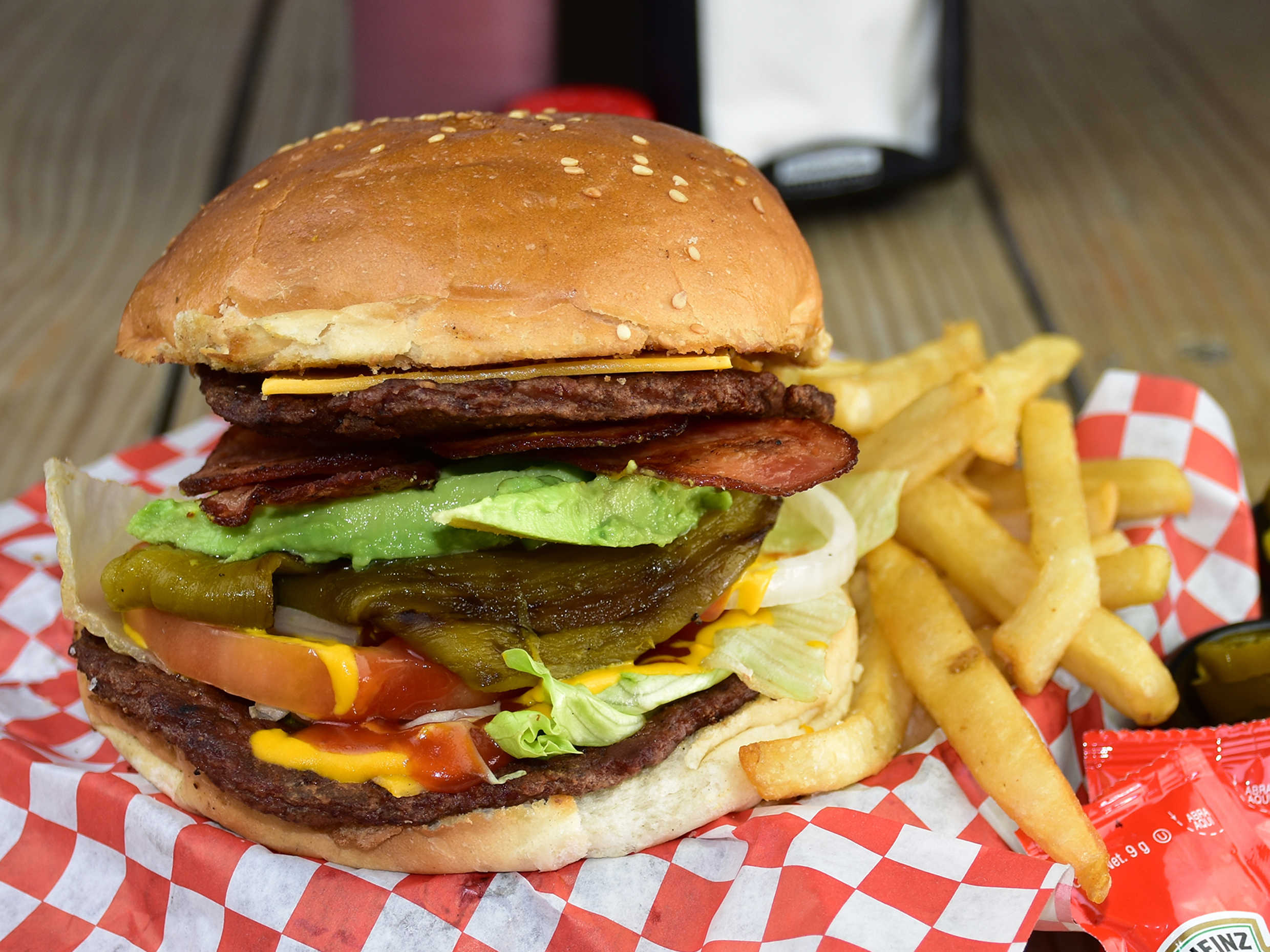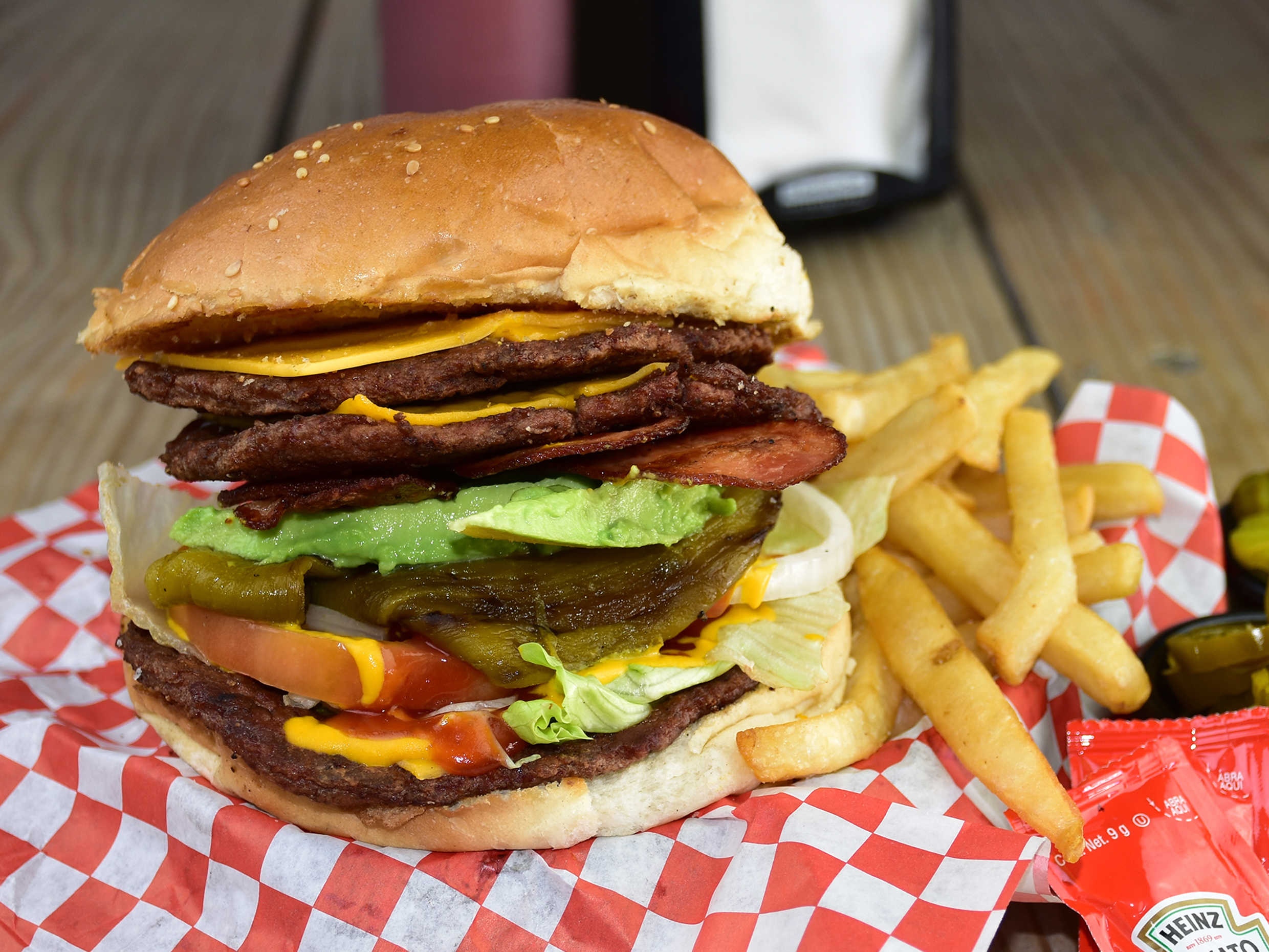 Doble carne, tocino, chile verde, aguacate, queso amarillo, mayonesa, catsup, mostaza y verdura. Acompañada de papas.