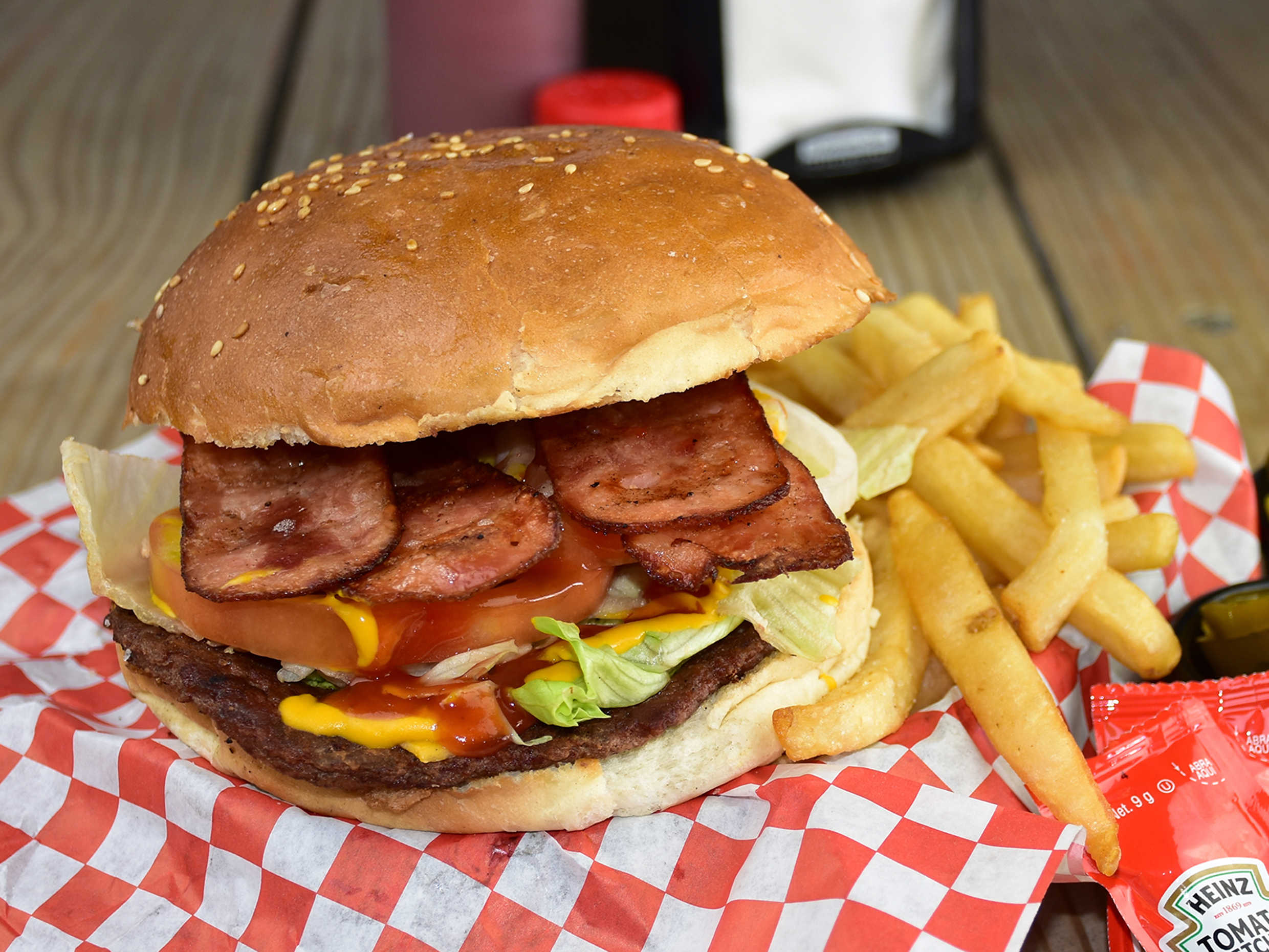Hamburguesa Carne de 100 g acompañada de tocino, queso amarillo fundido, mayonesa, kétchup, mostaza y vegetales frescos. Servida con una porción de papas