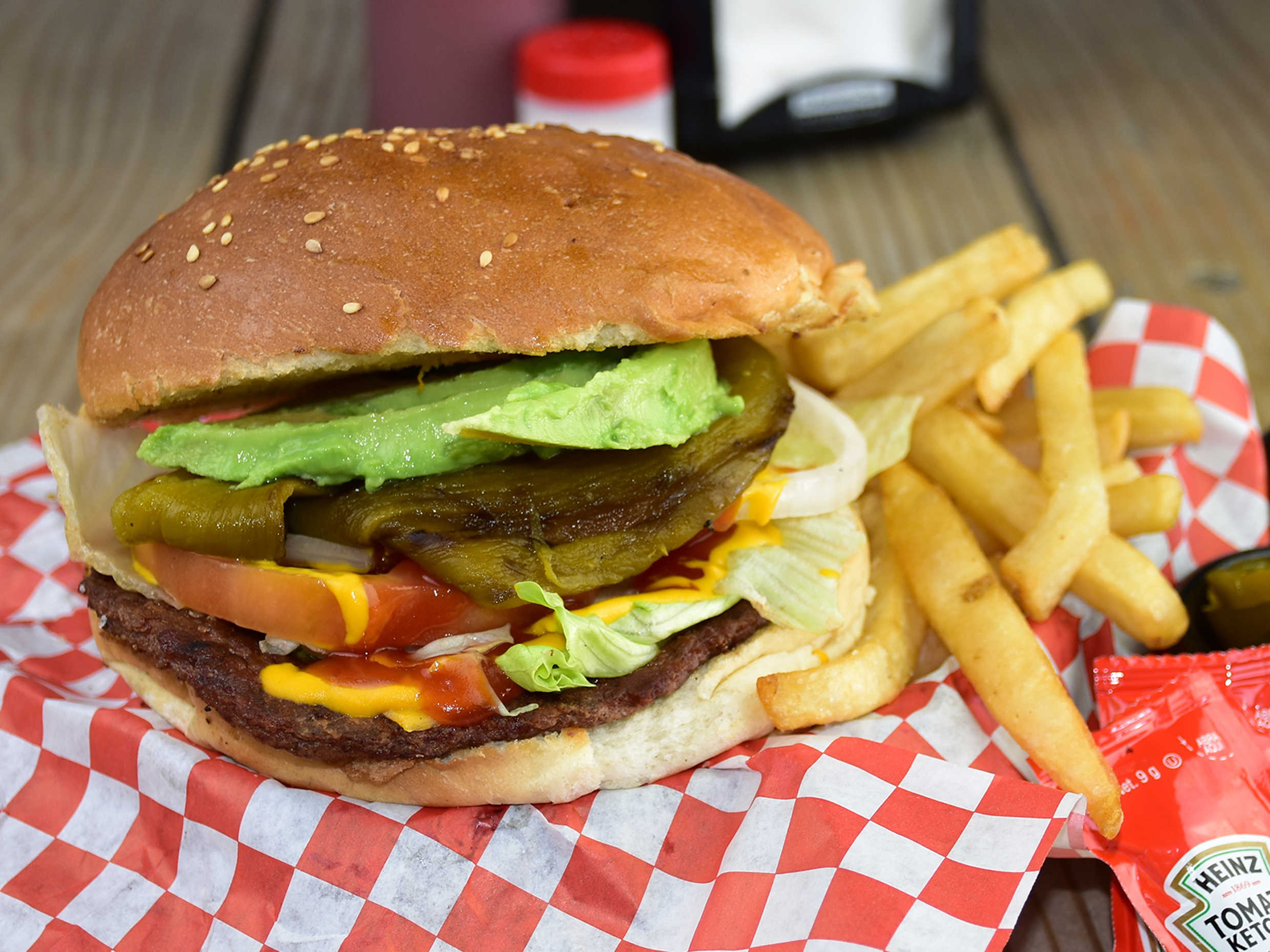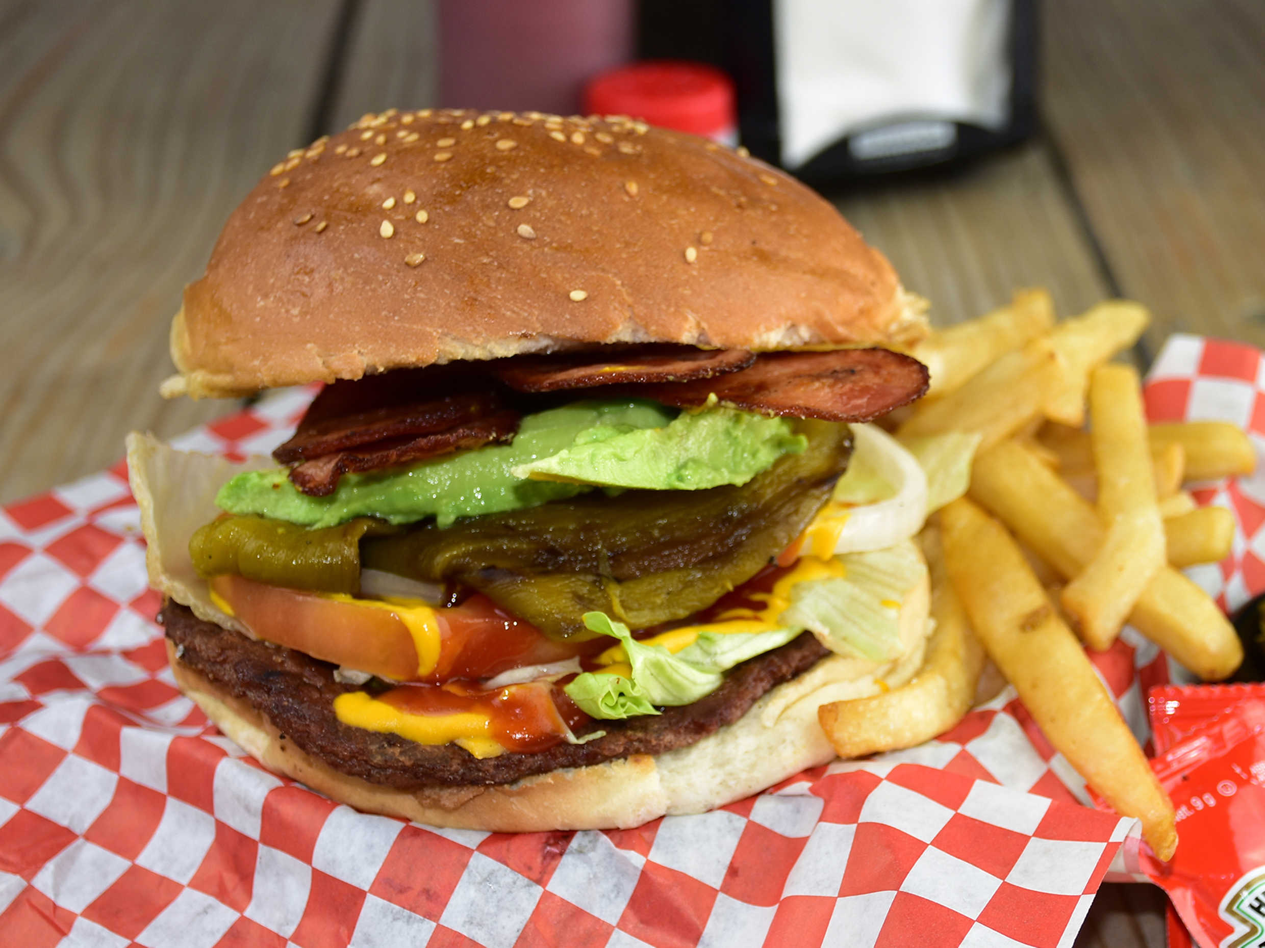 Hamburguesa Especial, Carne de 100 g acompañada de tocino crujiente, chile verde asado, aguacate cremoso, queso amarillo fundido, mayonesa, kétchup, mostaza y vegetales frescos. Servida con una porción de papas