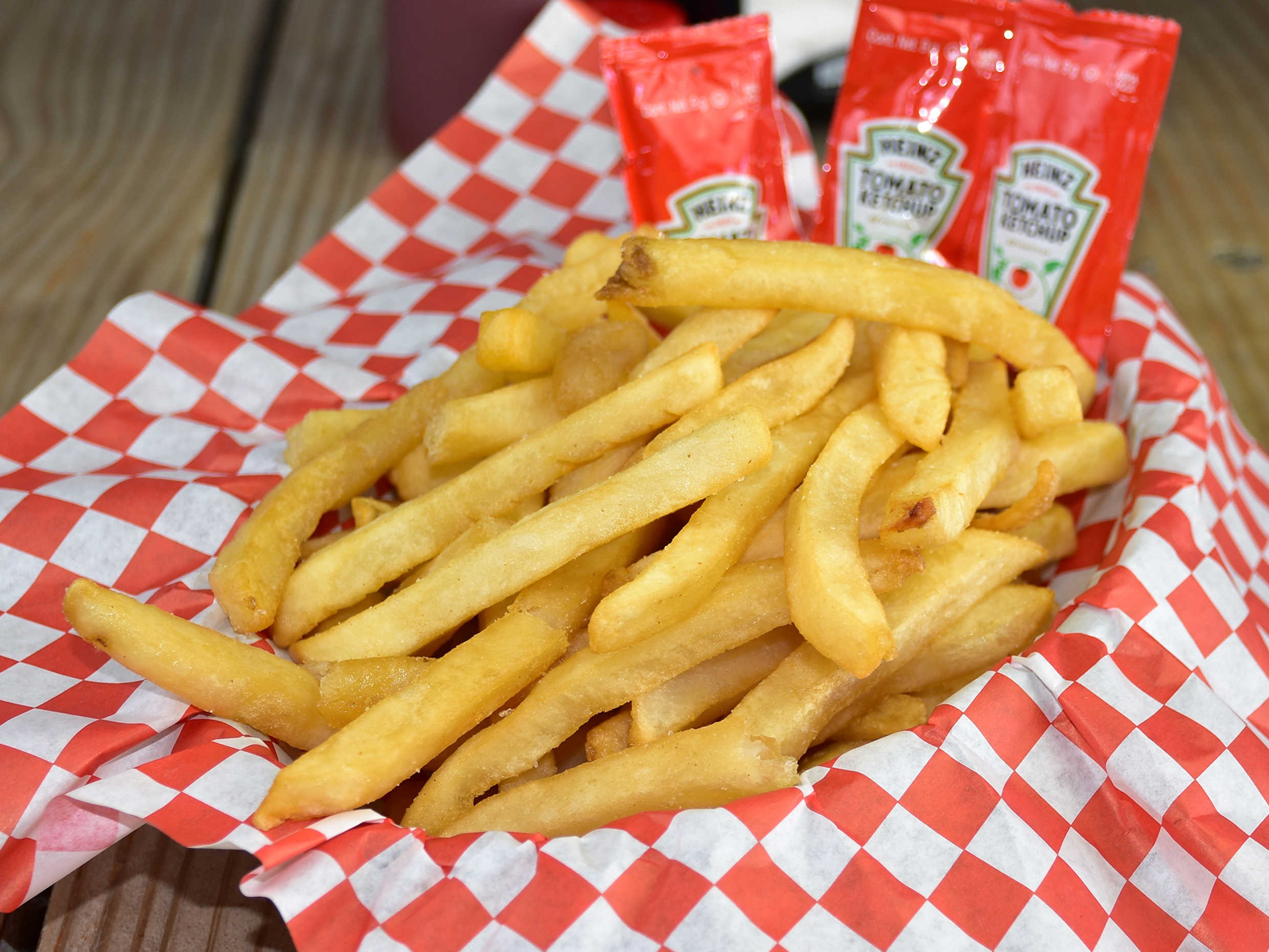 Doble carne, queso amarillo, mayonesa, catsup, mostaza y verdura. Acompañada de papas.